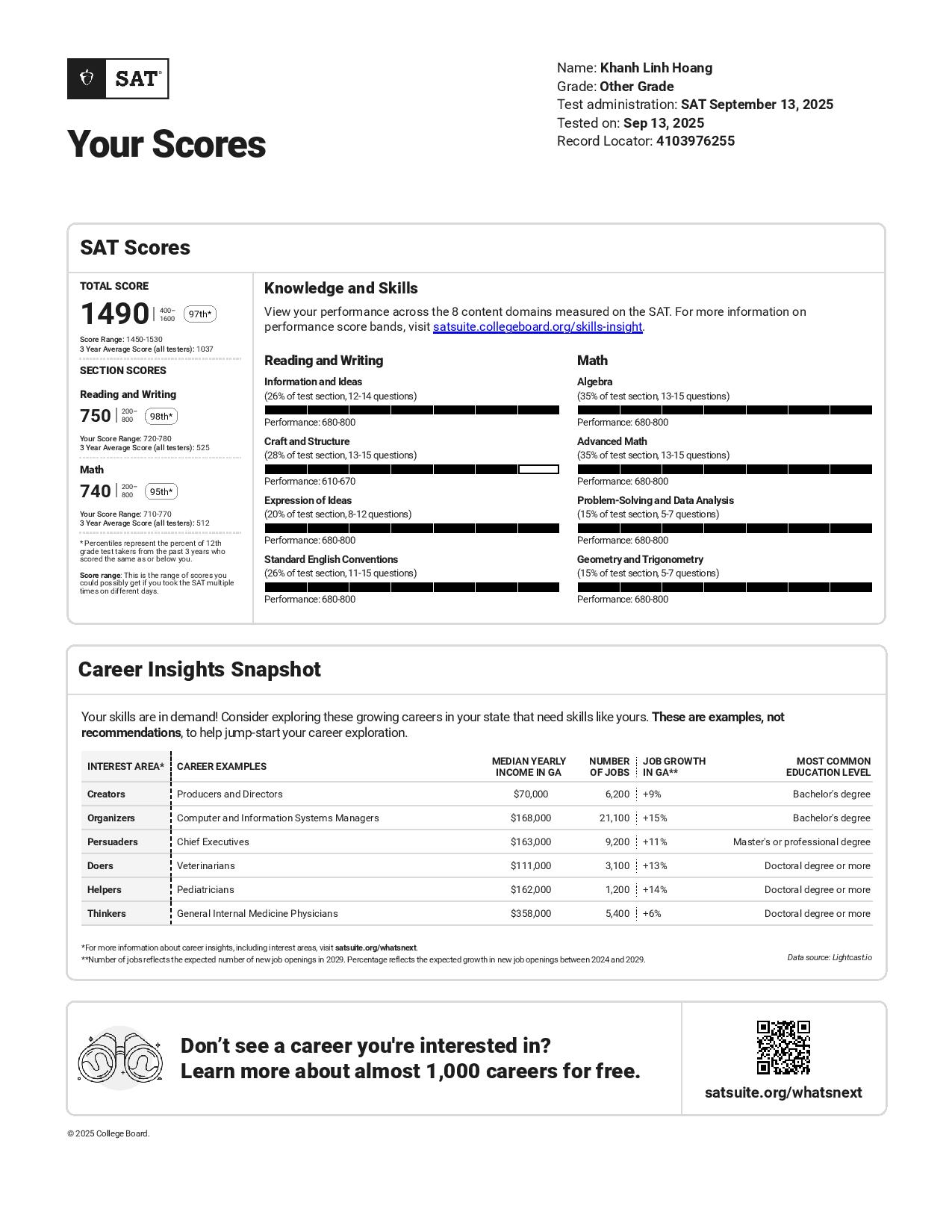 Điểm Reading & Writing của em tăng từ 710 lên 750, cùng với điểm Toán của lần thi trước đã giúp cho điểm superscore của em đạt 1540.