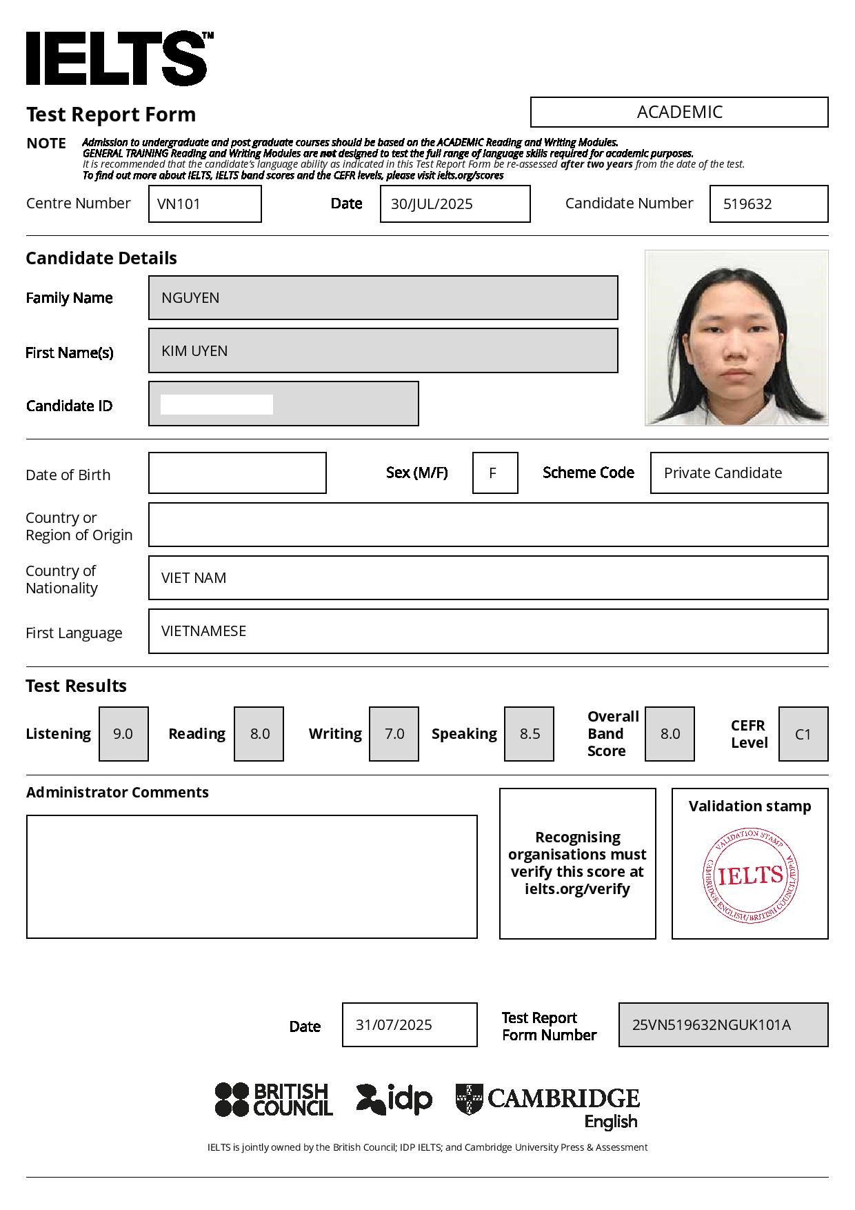 Em cảm thấy mình tiến bộ nhất ở kỹ năng Speaking vì hai năm trước đó em thi chỉ có 6.5 Speaking. Nhưng vào cuối tháng 7 năm 2025 vừa qua thì phần thi này lại cán mốc band 8.5. Chính vì thế, em muốn dành lời cảm ơn chân thành đến với tất cả thầy cô đã cùng đồng hành và hỗ trợ em trong quá trình học tập vừa qua. Dù chỉ vỏn vẹn trong 1 tháng ngắn ngủi ôn luyện nhưng em đã có được sự tự tin và kỹ năng cần thiết để vượt qua kỳ thi IELTS đợt này.