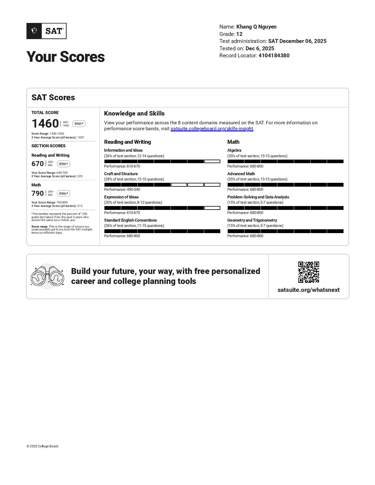 Em cảm thấy khóa học SAT tại Summit thực sự hiệu quả. Đội ngũ giáo viên không chỉ chuyên môn cao mà còn nhiệt tình, luôn sẵn sàng hỗ trợ học viên mọi lúc. Tài liệu học được biên soạn kỹ lưỡng, bám sát format đề thi thật, cùng cơ sở vật chất hiện đại đã tạo điều kiện học tập tốt nhất. Nhờ vậy, em đã đạt được điểm 1460 mong muốn một cách dễ dàng.