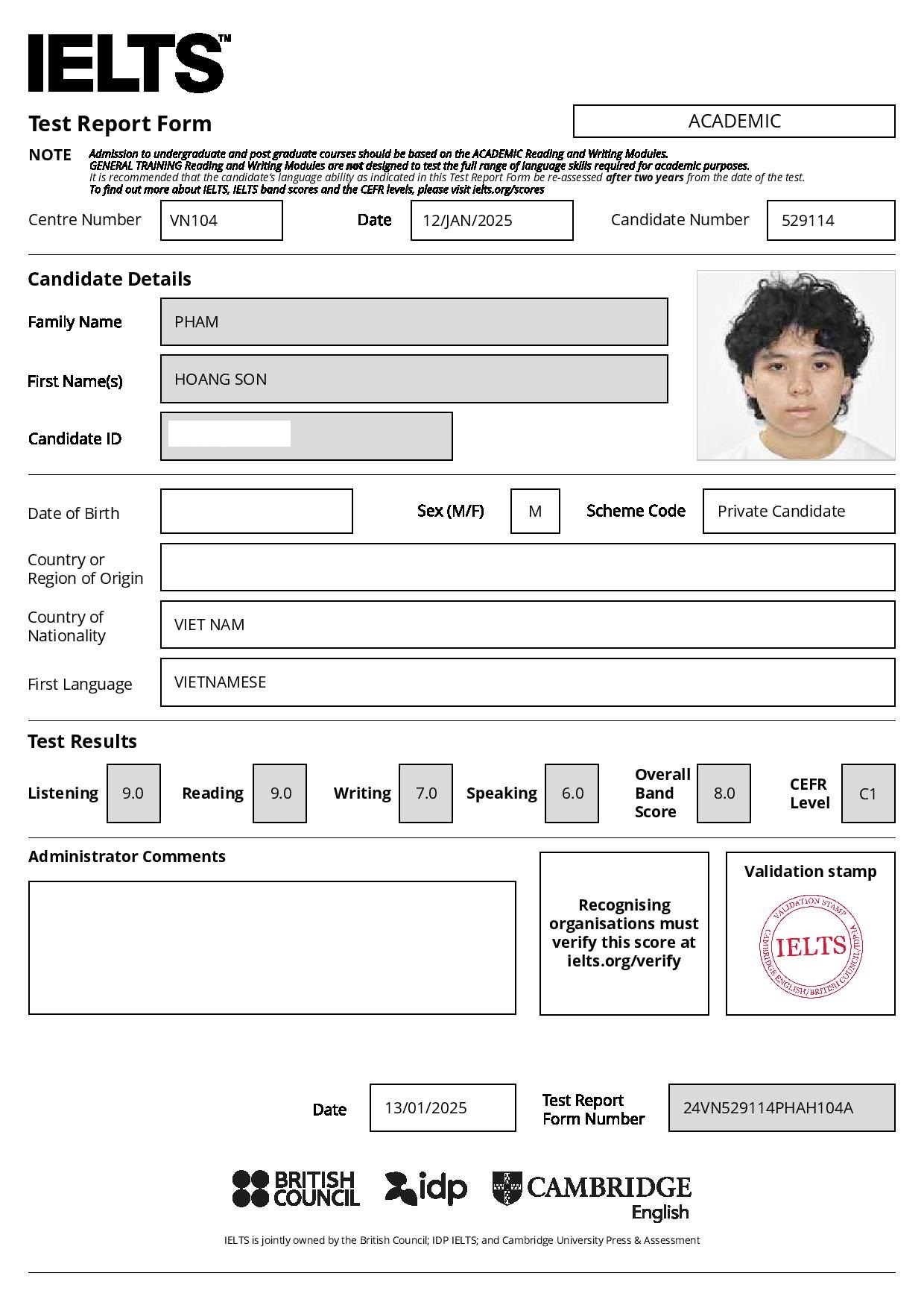Khóa học IELTS tại Summit đã mang đến cho tôi trải nghiệm học tập tuyệt vời. Thầy cô không chỉ tận tâm mà còn rất giàu kinh nghiệm, luôn sẵn sàng hỗ trợ và đưa ra những lời khuyên hữu ích. Các bạn cùng lớp thì hòa đồng, tạo nên một môi trường học tập sôi động và đầy động lực. Tài liệu học tập tại Summit được thiết kế chi tiết, bám sát đề thi thực tế, kết hợp với cơ sở vật chất hiện đại, giúp tôi tự tin chinh phục mục tiêu IELTS