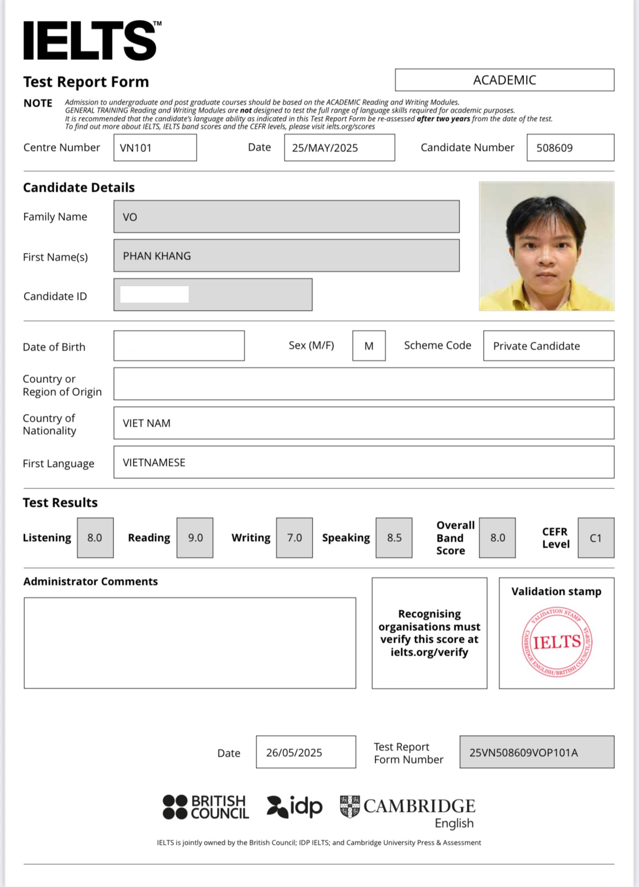 Em thấy mình tiến bộ nhiều nhất là ở kĩ năng Reading. Hồi trước, điểm Reading của em chỉ rơi vào khoảng band 7.0 và lúc đó em còn thiếu những kĩ năng để làm các bài đọc hiệu quả và kịp giờ. Sau khi ôn luyện tại Summit, em không những có thể hoàn thành đúng tiến độ bài mà còn có thời gian dư để kiểm tra lại phần mình đã làm.